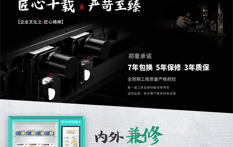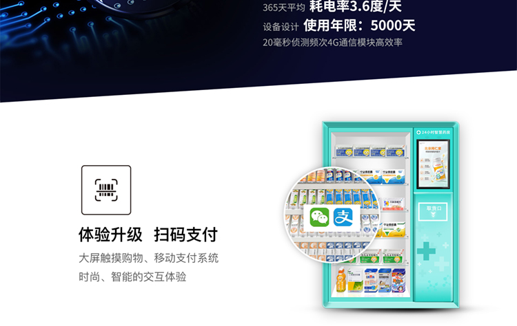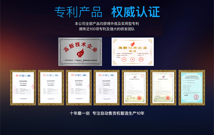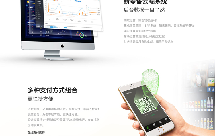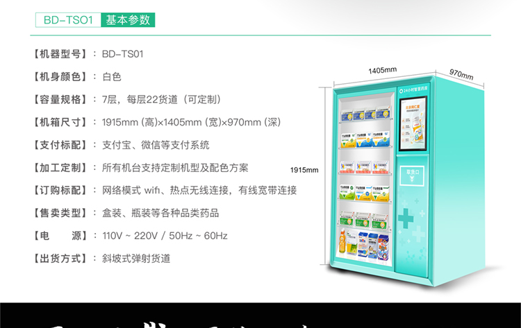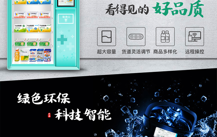 产品优势:全钢机身,一体式超微孔发泡;三色LED不锈钢防尘防水键盘, 模块化设计装配理念,智能信息化监控;一机可多式货道搭配:弹簧货道、推送货道、升降货梯自由定制 ,货道托盘宽窄长深自由扩展调整,售卖商品尺寸大小不受限制;智能升降托盘接货,保证商品完好无损;GPRS、WIFI联网功能,实时云平台管理,具备智能信息查询 运营管理 销售分析 财务报表 支付管理 广告媒体投放、故障自我诊断,无线远程后台管理。